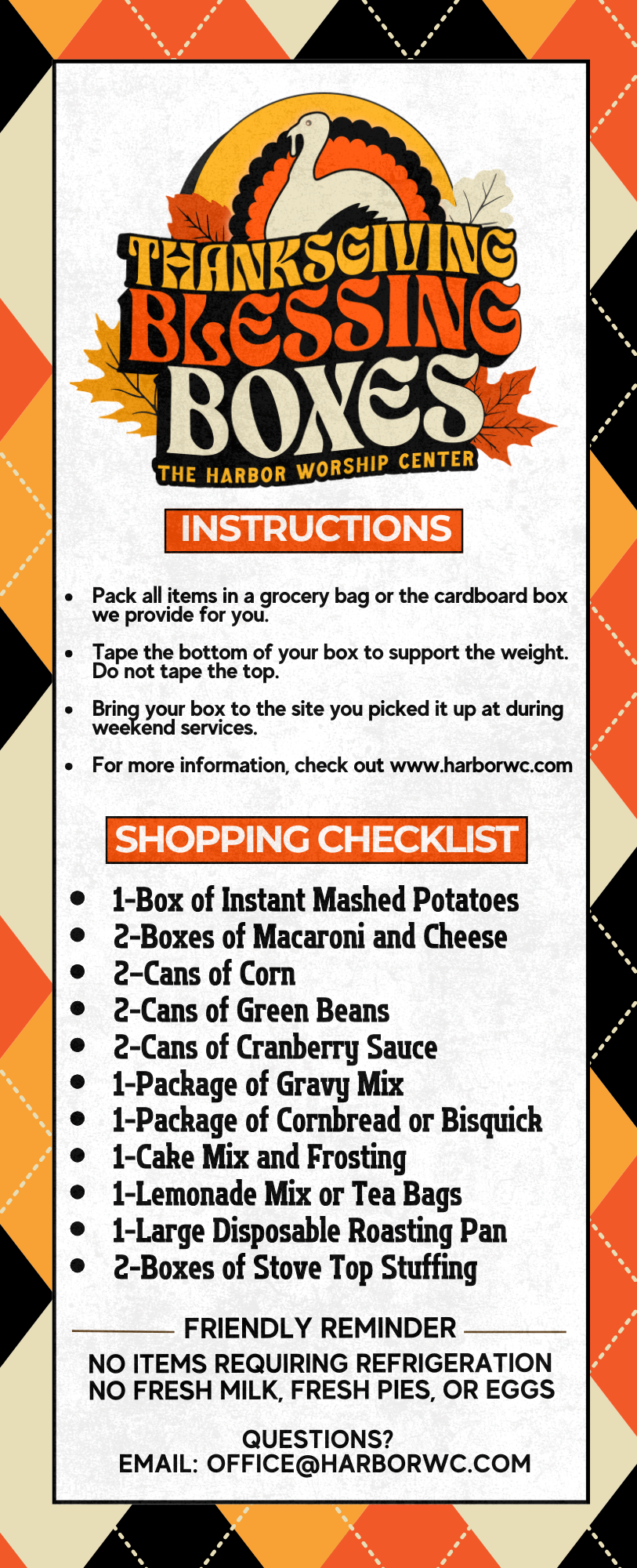 NOTE: ALL food must be NON-Perishable since boxes will Not Be Refrigerated.